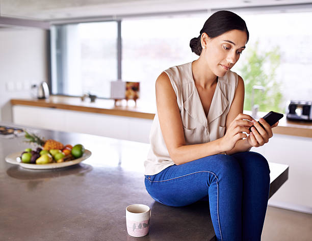 Shot of an attractive young woman sending a text message from her kitchenhttp://195.154.178.81/DATA/i_collage/pi/shoots/783513.jpg